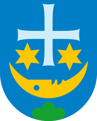 In Blau über grünem Dreiberg ein steigender, gebildeter, goldener Mond, überhöht von einem silbernen Kreuz, unter dessen Armen je ein goldener Stern.