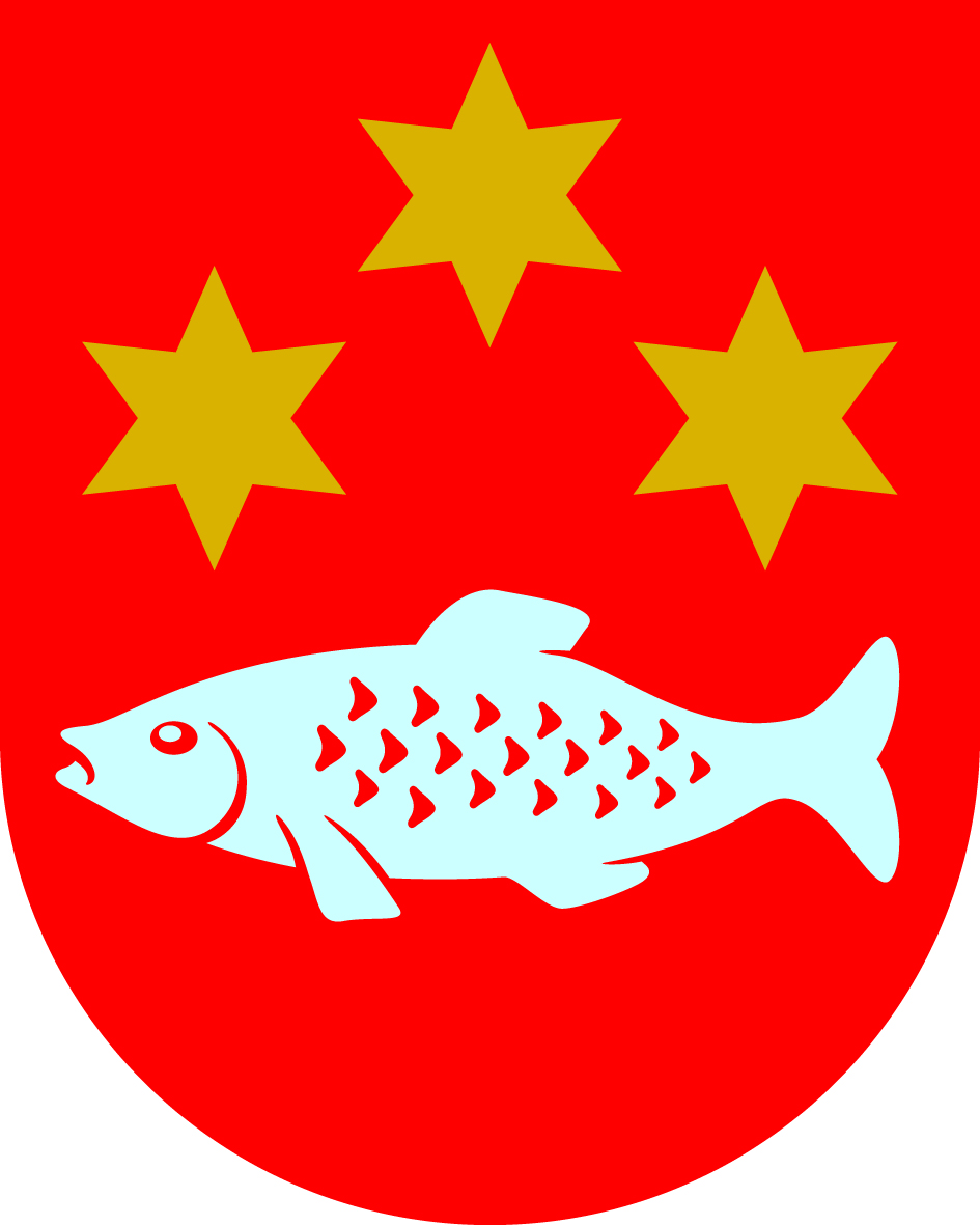 Das Wappen zeigt einen silbernen Fisch, überhöht von drei fünfstrahligen, goldenen Sternen. Der Hintergrund ist rot.