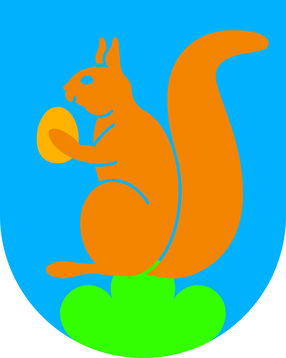 Das Wappen zeigt ein auf einem grünen Dreiberg sitzendes, braunes Eichhörnchen, mit den Pfoten eine hellbraune Nuss haltend. Der Hintergrund ist blau.