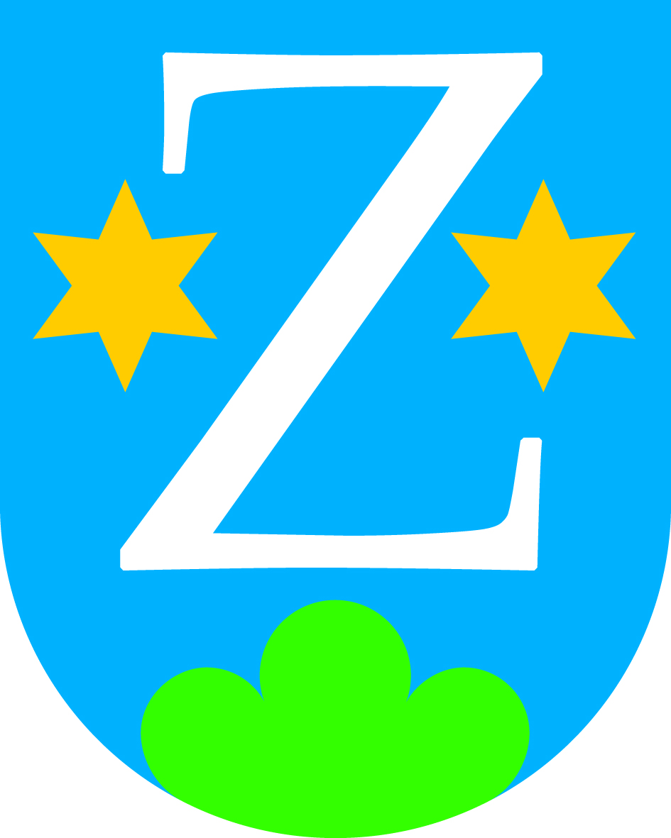 Das Wappen zeigt ein grosses weisses Z über einem grünen Dreiberg, rechts und links flankiert von zwei goldenen, sechszackigen Sternen. Der Hintergrund ist blau.